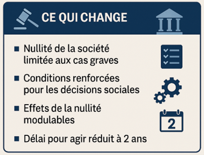 La nullité n’est plus une menace omniprésente, mais une sanction réservée aux atteintes sérieuses. C’est une réforme pragmatique, tournée vers la vie des affaires, qui offre aux dirigeants un cadre plus lisible et plus équilibré pour piloter leur société.